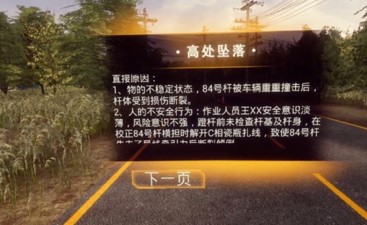 體驗(yàn)項(xiàng)目包含:應(yīng)電觸電、桿塔倒塌、基坑中毒、索道墜落、高處墜落傷害、帶電拉(合)接地刀閘、帶負(fù)荷合(拉)令克、登高線(xiàn)路行走、電桿倒塌傷害、反供電觸電事故、高空墜落傷害、農(nóng)電電桿作業(yè)VR培訓(xùn)。